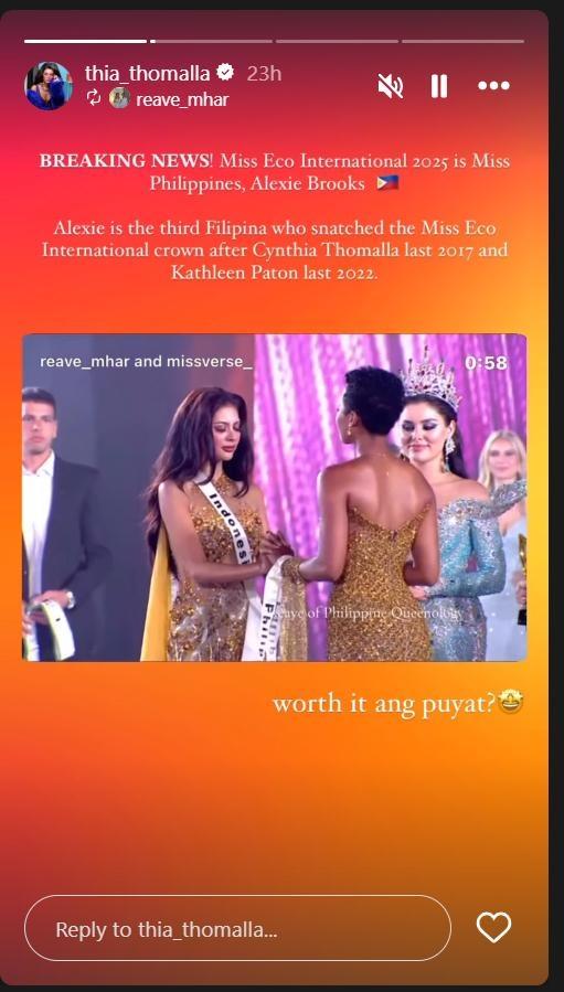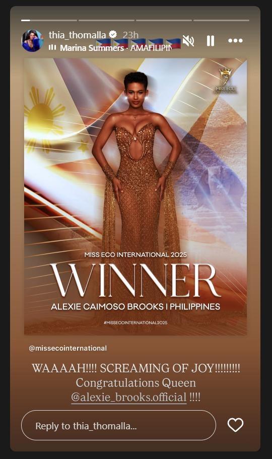 One of the beauty queens cheering for Alexie Brooks' historic win as Miss Eco International 2025 is First Yaya actress Thia Thomalla.