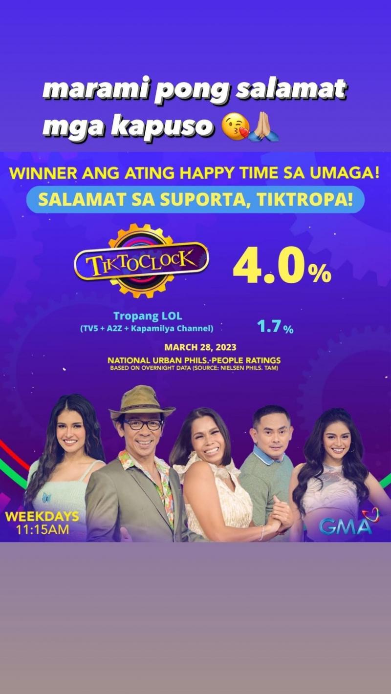 Samantala, si Rabiya ay proud na ipinost ang kanilang ratings sa TiktoClock sa kaniyang Instagram stories. Si Faith naman ay nag-post din na may kasamang heart emoji.