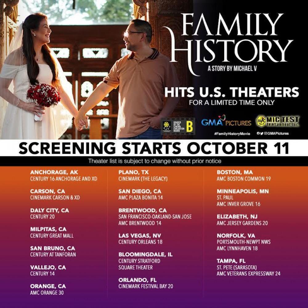 “Hello USA! #FamilyHistoryMovie will finally be shown in AMC and Cinemark theaters sa East & West Coast!