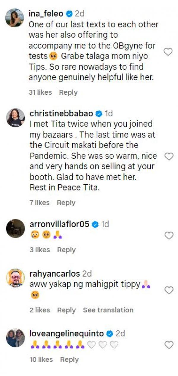 Several celebrities reacted to Tippy's heartfelt post, including versatile actress Ina Feleo, who shared that Happy Dos Santos is such a sweet person. She noted, “One of our last texts to each other was her also offering to accompany me to the OBgyne for tests. Grabe talaga mom niyo Tips. So rare nowadays to find anyone genuinely helpful like her”
