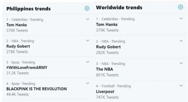 The names Tom Hanks and Rudy Gobert occupied the first and second spots, respectively, on the trend list both in Twitter worldwide and in the Philippines.