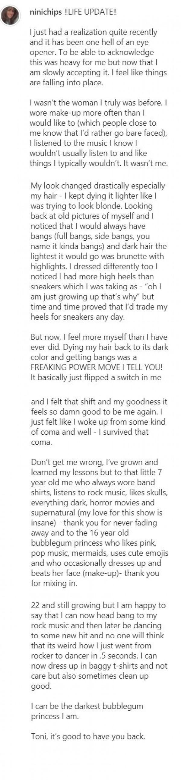 “Don't get me wrong, I've grown and learned my lessons but to that little 7-year-old me who always wore band shirts, listens to rock music, likes skulls, everything dark, horror movies and supernatural (my love for this show is insane) - thank you for never fading away and to the 16 year old bubblegum princess who likes pink, pop music, mermaids, uses cute emojis and who occasionally dresses up and beats her face (make-up)- thank you for mixing in.”