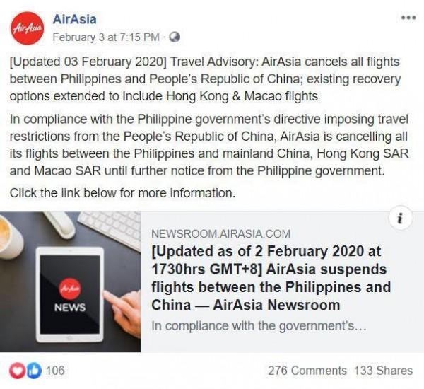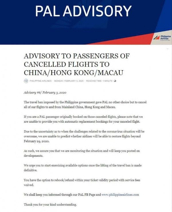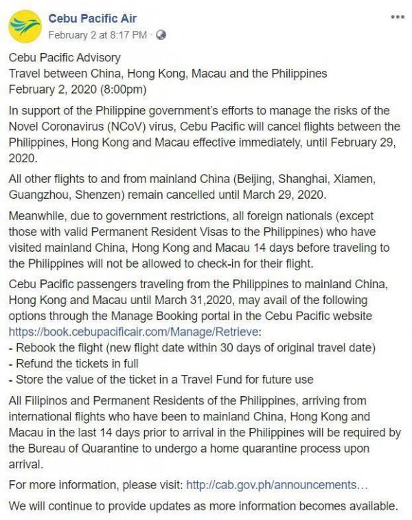 This has led airlines in the Philippines to cancel flights between the Philippines and China, including its territories.