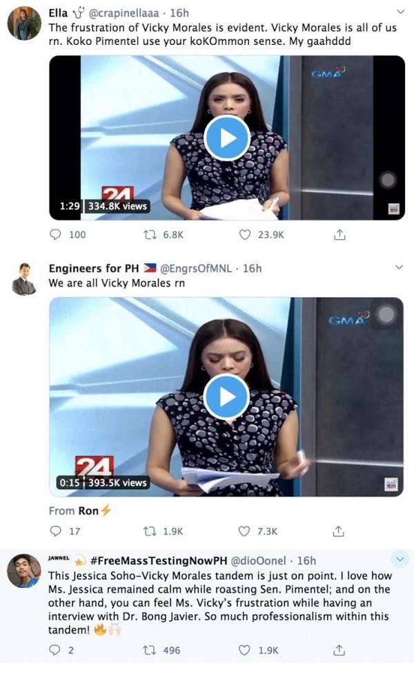 Netizens gave plaudits to Vicky and her co-anchors, Jessica Soho and Atom Araullo, for being inquisitive and straightforward while maintaining professionalism as they conducted the interviews and delivered the news.