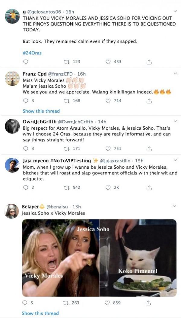 24 Oras, Jessica Soho, and Vicky Morales quickly became trending topics on Twitter Philippines, and the feed was flooded with either compliments or funny memes.