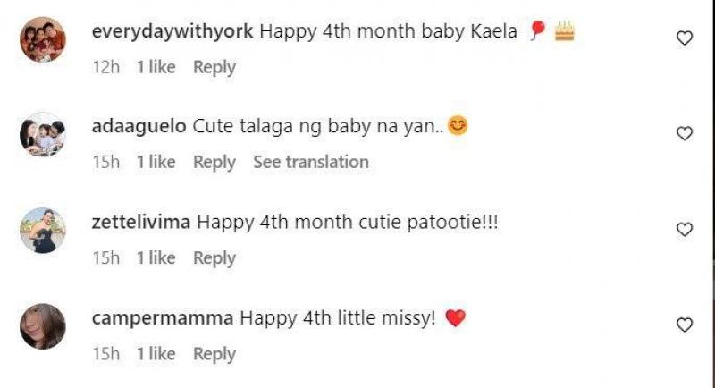 She wrote on Instagram, “Breakfast at Kaela's! Breakfast Menu: Chubby Arm Rolls. HAPPY 4 MONTHS to my big baby! You can now roll-over! kahit tulog, gumugulong ka pa rin. I love you!”