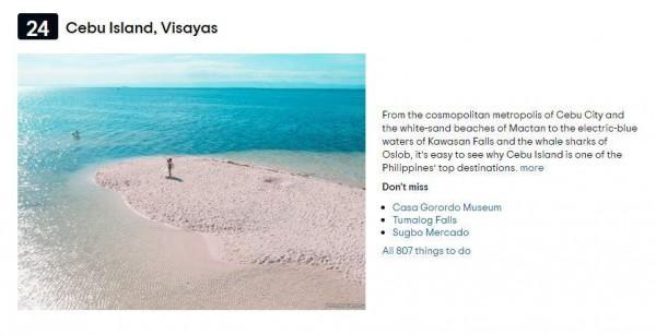 Cebu took the 24th spot on the list. This comes as no surprise as the island boasts of beautiful white sand beaches in Moalboal, Malapascua, and Bantayan, to name a few. They also have historical tourist attractions such as the Magellan's Cross and Fort San Pedro. Many tourists are also drawn to the majestic whale sharks of Oslob. And, its capital, Cebu City, also has malls that are at par in size, architectural design, and attractions with the ones in Manila.