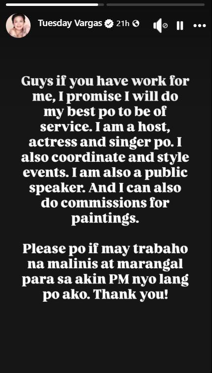 Nanawagan din si Tuesday sa kanyang Instagram story, ipinahayag niya na siya ay isa ring mahusay na host, singer, public speaker, at may talento rin sa pag-coordinate at style ng events, maging ang pagtanggap ng mga komisyon sa pagpipinta.