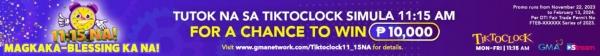 Huwag magpahuli at manood ng TiktoClock Lunes hanggang Biyernes, 11:15 a.m. para sa pagkakataong manalo sa TiktoClock 11:15 na promo! Promo runs from November 22, 2023 to February 13, 2024.