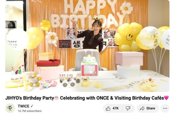 To feel the presence of ONCEs, Jihyo ended her birthday video with a vlog showing her surprise appearances at a birthday cafe and pub that were prepared by fans for her birthday.