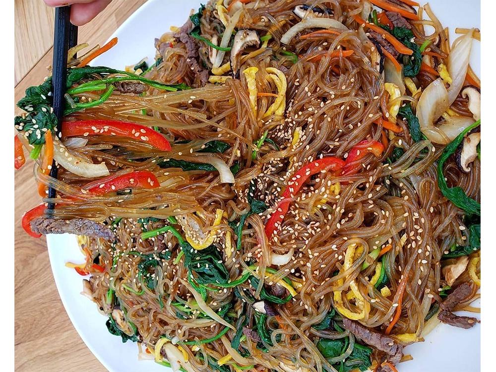 This traditional Korean noodle dish is often served with stir-fried potato, thinly shredded vegetables, beef, with a little soy sauce and sugar. Japchae is known for its slightly sweet taste and chewy texture. Its sweetness makes it a perfect pair for spicy Korean dishes.