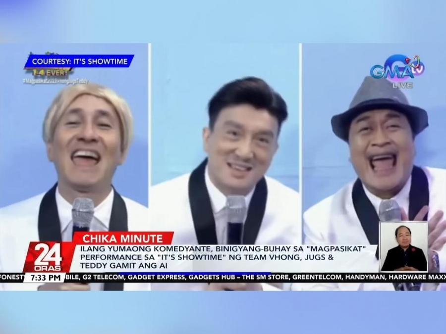 Nagbigay-pugay sina Vhong, Teddy, at Jugs sa ilang mga namayapang Pinoy comedian sa pamamagitan ng artificial intelligence o AI. Sa tulong ng AI technology, muling nasilayan sa telebisyon ang ilang mga yumaong komedyante ng bansa.