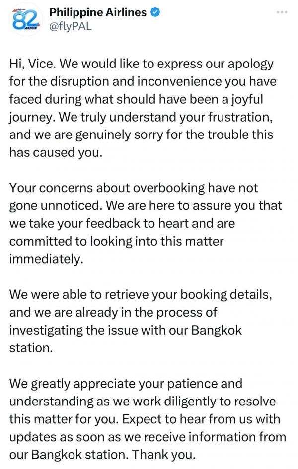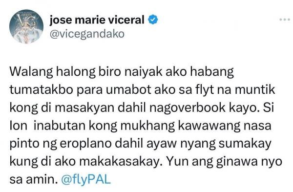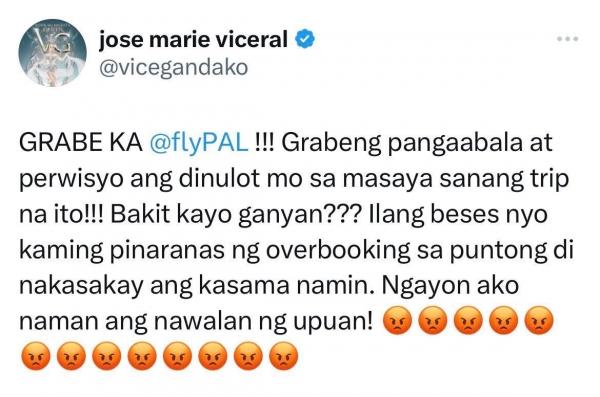 Post ni Vice, “Grabe ka @flyPAL Grabeng pangaabala at perwisyo ang dinulot mo sa masaya sanang trip na ito!!! Bakit kayo ganyan??? Ilang beses nyo kaming pinaranas ng overbooking sa puntong di nakasakay ang kasama namin. Ngayon ako naman ang nawalan ng upuan!”