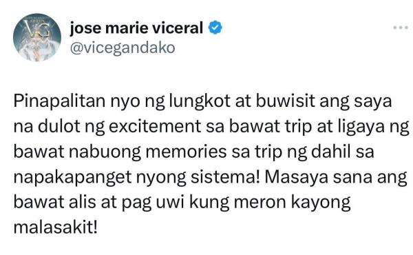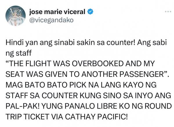 Sa social media na X, sunod-sunod ang naging post ni Vice tungkol sa kanilang hindi magandang experience sa isang airline company.