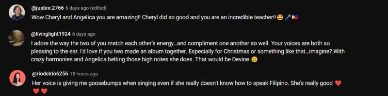 Meanwhile, comments of approval and requests to have the duo sing the full song were posted. Netizens expressed how proud they are already of Cheryl, and expressed how good a teacher Angelica is.