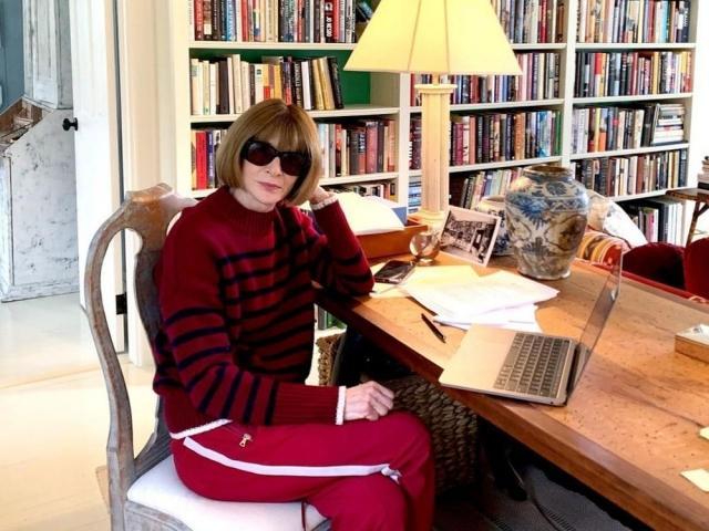 In the post made on American Vogue's account, Anna is seen stylishly sitting in her library wearing a striped red sweatshirt and pants.
