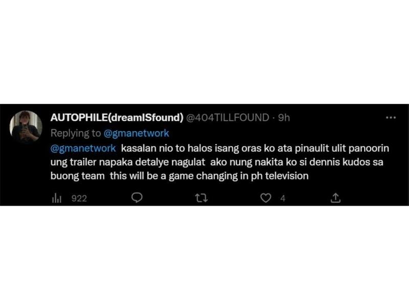Meanwhile, user @404TILLFOUND jokingly chided GMA for making him repeat the trailer for almost an hour, and also expressed their surprise at the appearance of Dennis Trillo in it.
