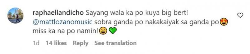 "Sayang wala ka po kuya big bert! @mattlozanomusic sobra ganda po nakakaiyak sa ganda po. miss ka na po namin!" Raphael wrote in the comments.