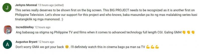 Saad ng isang netizen, "This series really deserves to be shown first on the big screen. This BIG PROJECT needs to be recognized as it is another first on Philippine Television. Let's show our support for this project and who knows, baka masundan pa ito ng mas malalaking series kasi tinatangkilik ng mga manonood. :)"