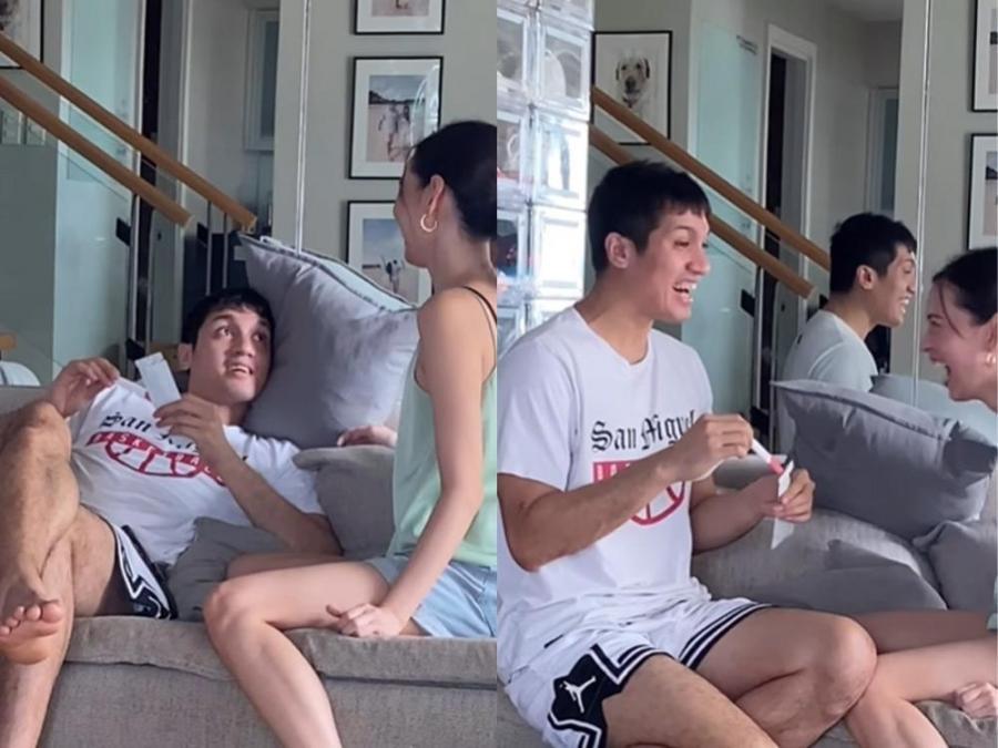 Former Miss World Philippines Laura Lehmann captures the moment Von Pessumal learns they're going to be parents.