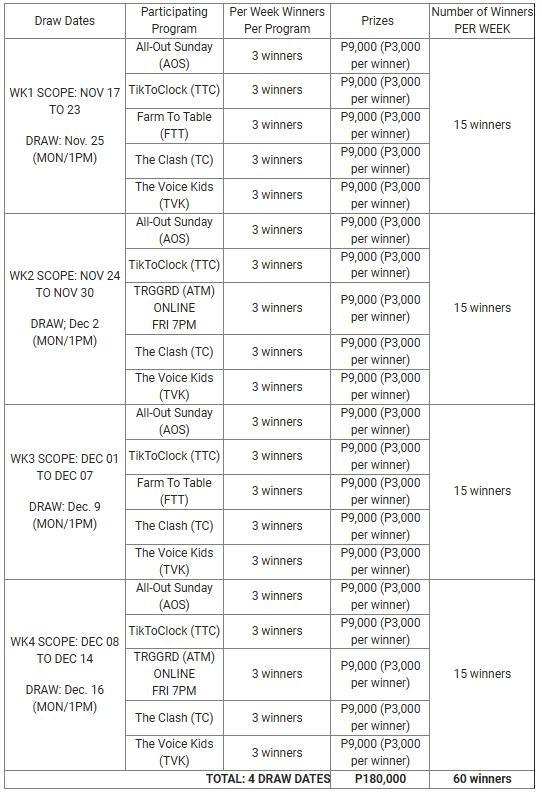 Entries must be sent during the actual episode airing, with a correct answer are eligible to win. The first three participants to submit the correct answer will be declared as winners of P3,000 each.