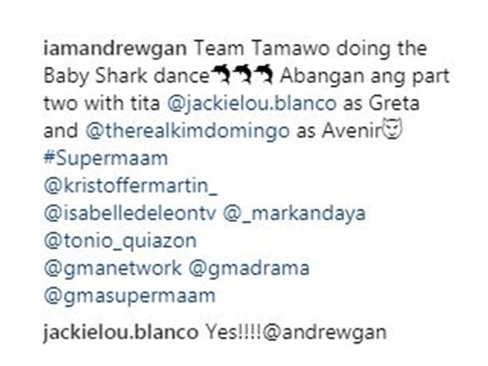 Ika pa ni Andrew, next time ay dapat kasama na nila si Jackie Lou Blanco bilang Greta at si Kim Domingo bilang Avenir. Agad naman pumayag ang reyna ng mga Tamawo.