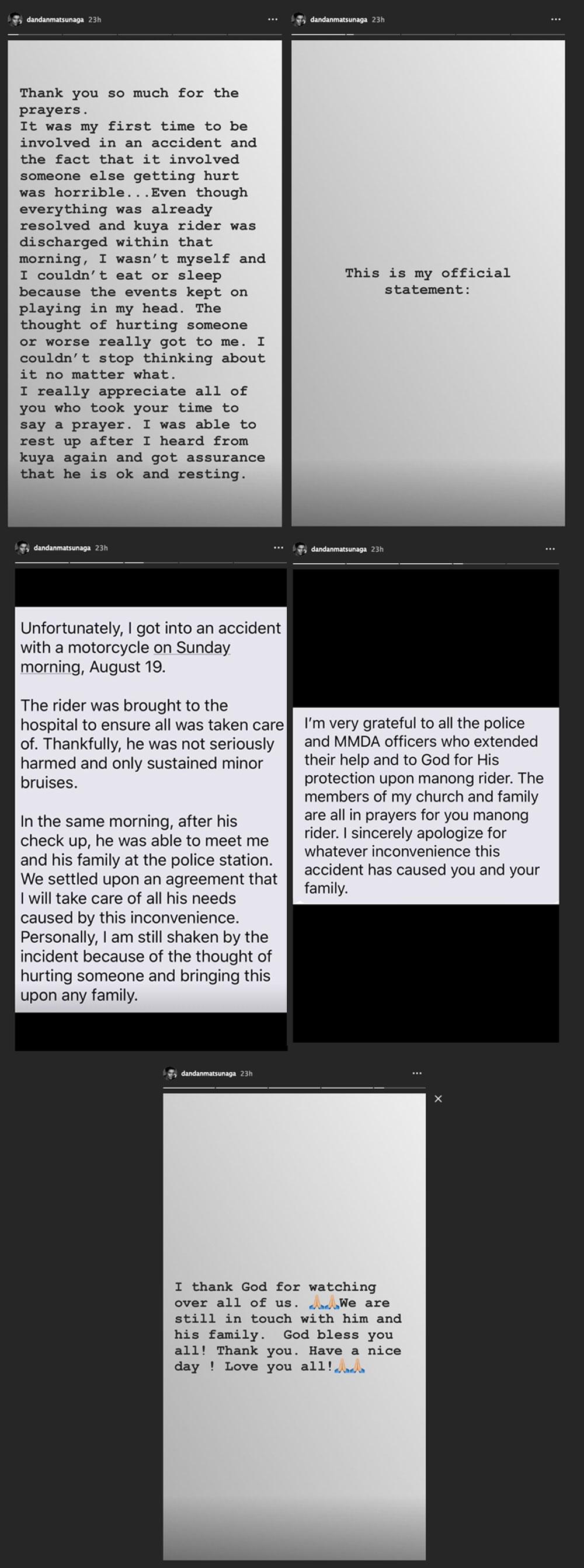 Brazilian-Japanese model Daniel Matsunaga issued an official statement after he got into a traffic accident on August 19. His car accidentally hit a motorcycle, injuring the rider.