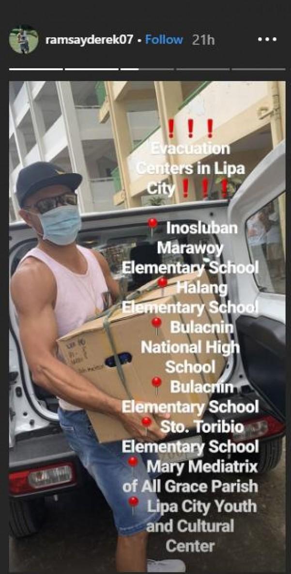 Pumunta si Derek sa evacuation center sa Inosloban-Marawoy Elementary School sa Lipa City at personal na namigay ng packed relief goods.