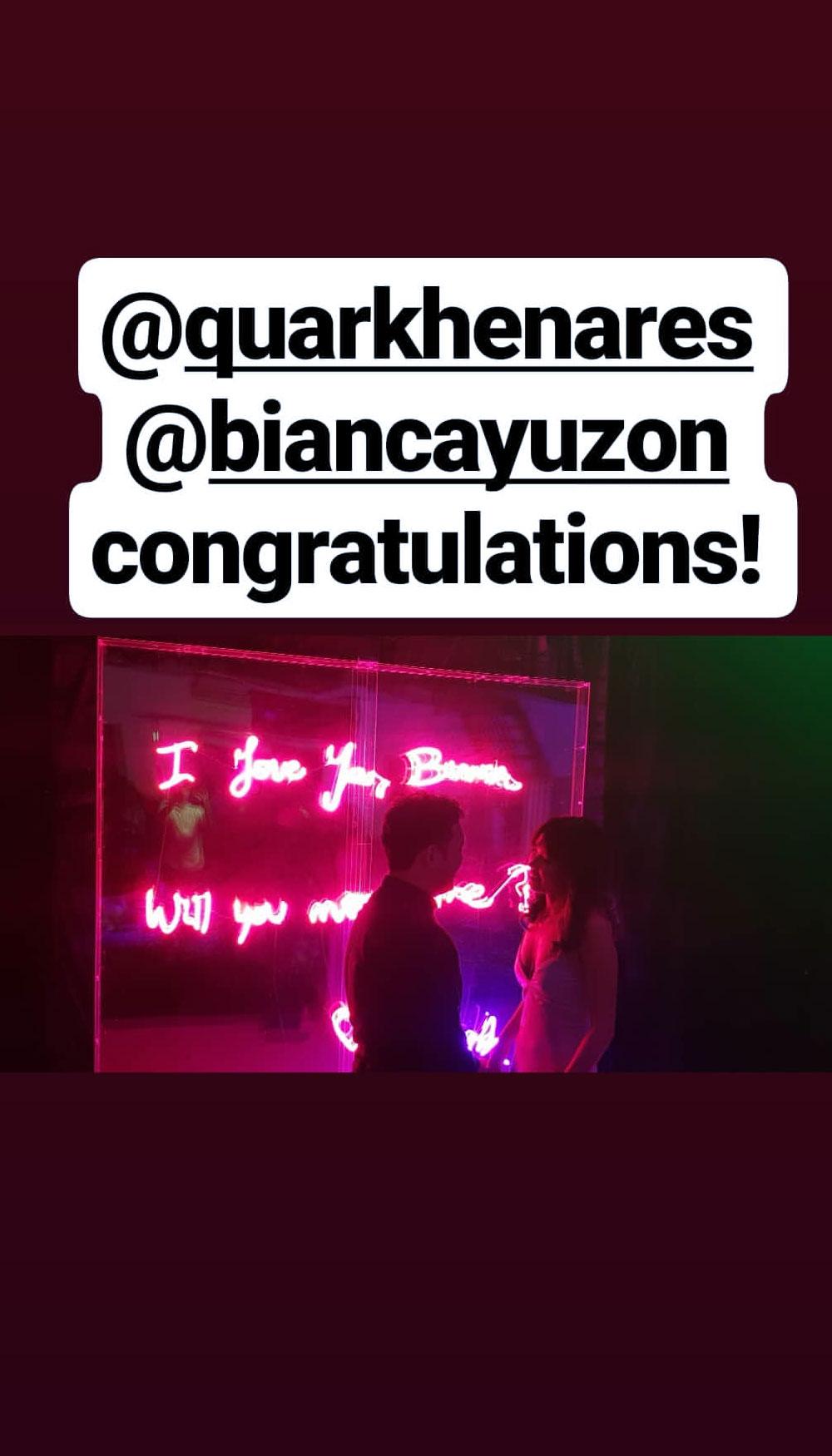 Film director Quark Henares, the son of celebrity doctor Vicki Belo, popped the question to his singer-songwriter girlfriend Bianca Yuzon on Friday, April 6.