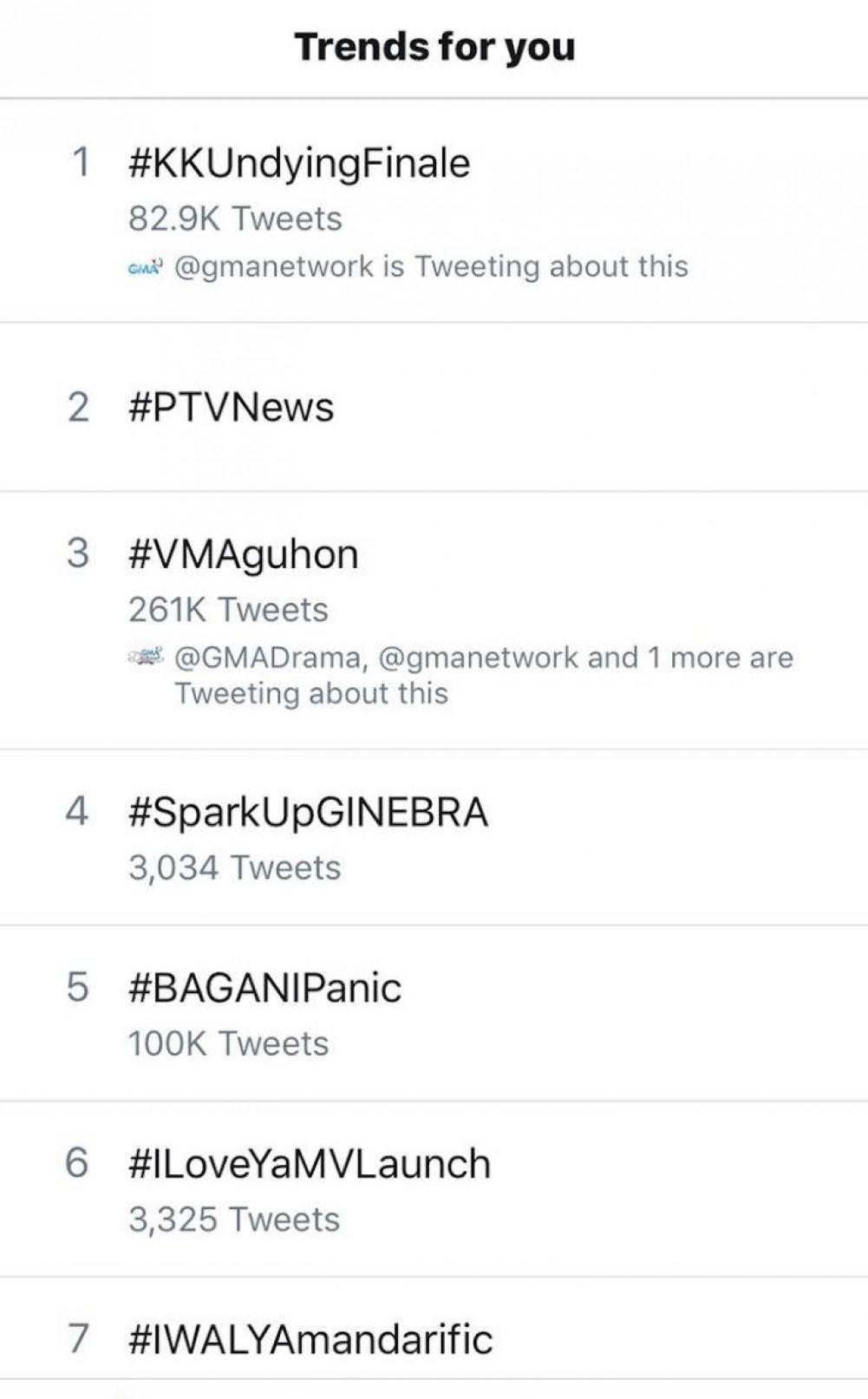Nasa top spot ng trending topics list ng Twitter Philippines ang official hashtag ng finale na #KKUndyingFinale.