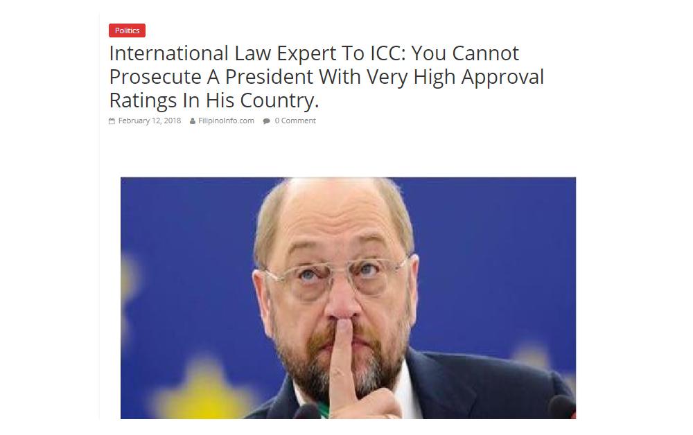 Matapos ang announcement ng ICC ay pumutok din ang article mula sa website na www.filipinoinfo.com na nagsasabing bawal daw i-prosecute ang presidenteng may mataas na approval rating ayon sa isang international law expert.