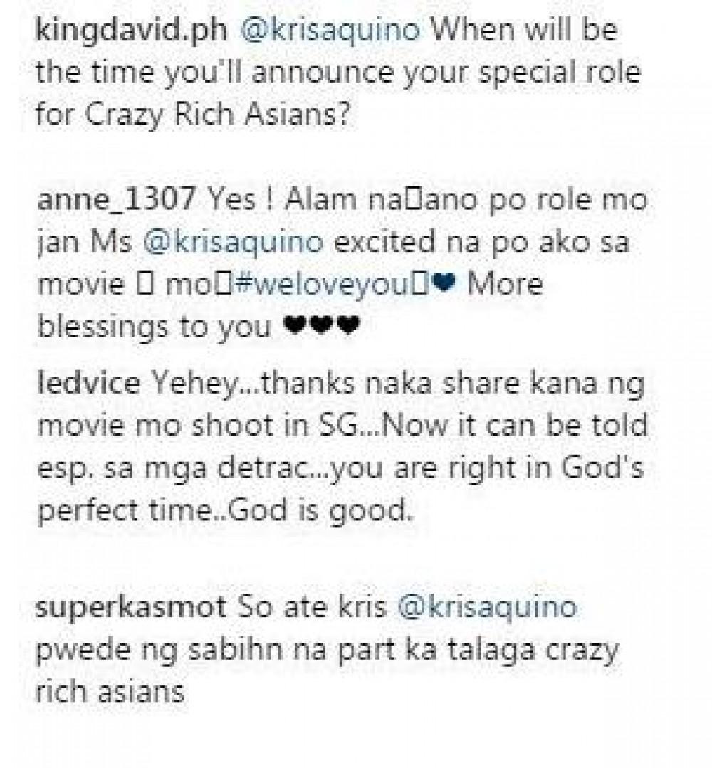 Kris posted the covers of Singaporean novelist Kevin Kwan’s titles which include ‘Crazy Rich Asians,' 'China Rich Girlfriend,’ and ‘Rich People Problems.’ She also shared Kwan’s reaction on her photo with American filmmaker Jon Chu, who is also the director of ‘Crazy Rich Asian’s’ movie adaptation.