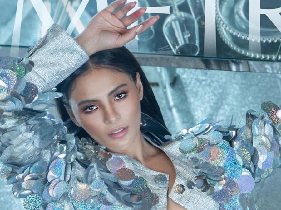 In Lovi's shot, she is seen wearing a two-piece set adorned with large holographic payette sequins that expose her abs and legs.