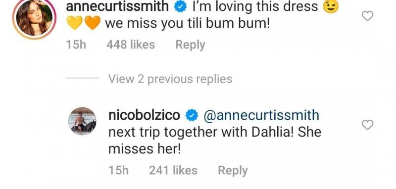 After the video's upload, Anne Curtis commented, “I'm loving this dress. We miss you tili bum bum!” to which Nico replied, “@annecurtissmith next trip together with Dahlia! She misses her!”