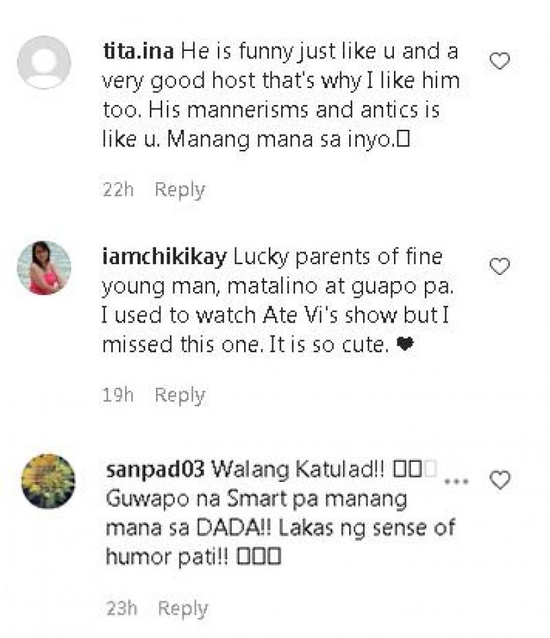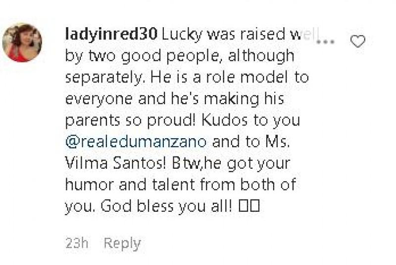 Ayon sa isang netizen, "Lucky was raised well by two good people, although separately. He is a role model to everyone and he's making his parents so proud! Kudos to you @realedumanzano and to Ms. Vilma Santos! Btw, he got your humor and talent from both of you. God bless you all!"