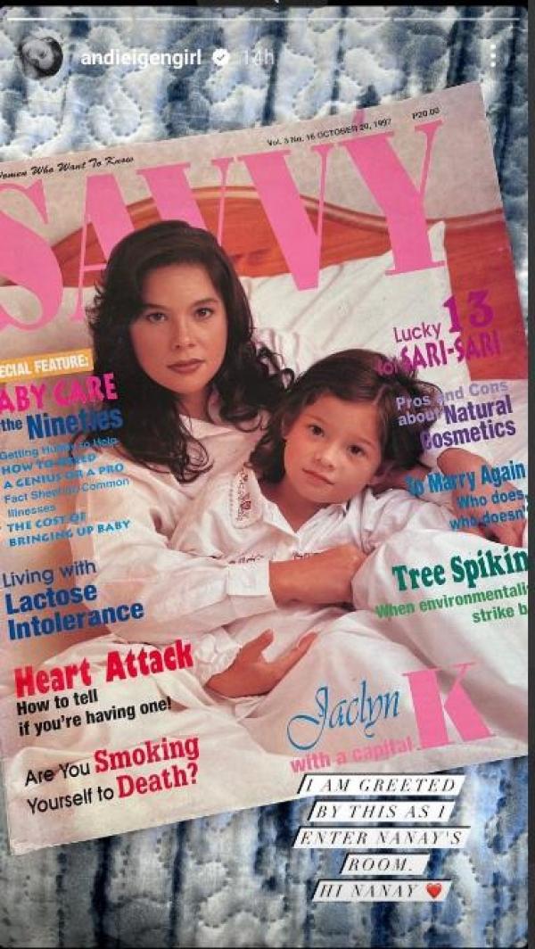 In Andi's Instagram Story, she posted a cover of Savvy magazine issued in October 1997. She then wrote in the captions, “I am greeted by this as I enter nanay's room. Hi Nanay”