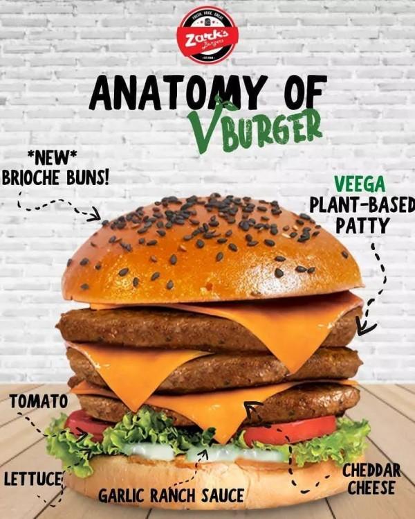 Zark's Burger recently unveiled their lip-smacking V-Burger, which is made with Veega plant-based patty, cheddar cheese, brioche buns, tomato, lettuce, and garlic ranch sauce.