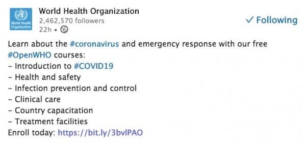 WHO's announcement of their COVID-19-related courses on OpenWHO | Source: WHO (LinkedIn)