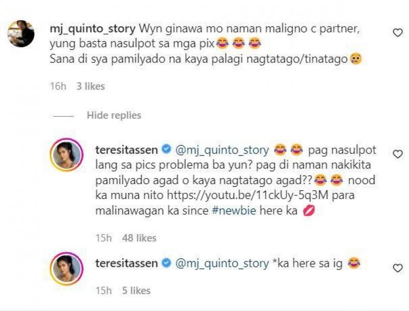 Paliwanag niya, “'Pag nasulpot lang sa pics problema ba 'yun? 'Pag 'di naman nakikita pamilyado agad o kaya nagtatago agad?”