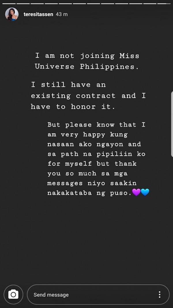 Sa pamamagitan ng Instagram story, nilinaw ni Winwyn, “I am not joining Miss Universe Philiippines.”