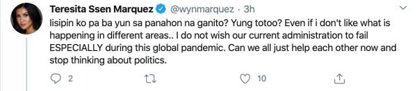 In a tweet made earlier today, she wrote the following: “I wish the government (well lalo na ngayon because in times like this) to stay united. There shouldn't be any politics now. I wish the executive and legislative branches can help as many people as they can in a day. I know limited ang movement ng lahat ngayon.