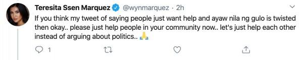 “If you think my tweet of saying people just want help and ayaw nila ng gulo is twisted, then okay. Please just help people in your community now. Let's just help each other instead of arguing about politics.”