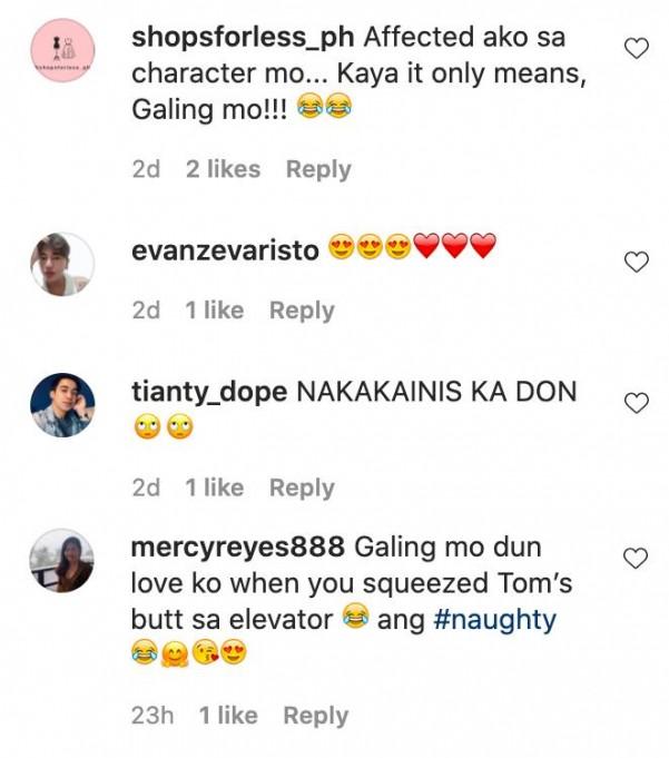 Meanwhile, another wrote, “Ang galing mo dun. Love ko when you squeezed Tom's butt sa elevator. Ang #naughty.”