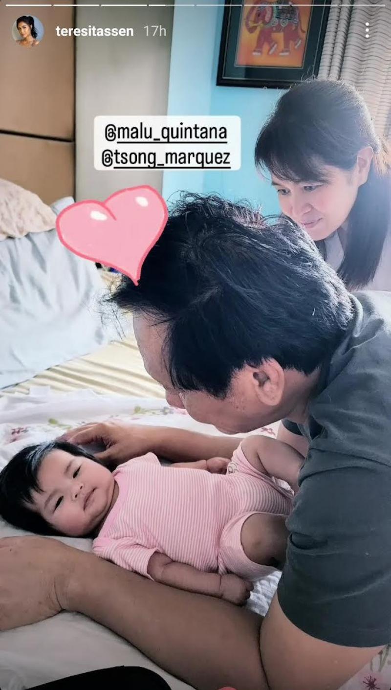 The first-time mom captioned her post, “Luna finds his lolo @tsong_marquez funny kaya ayan, gusto niya na isama pauwi..”