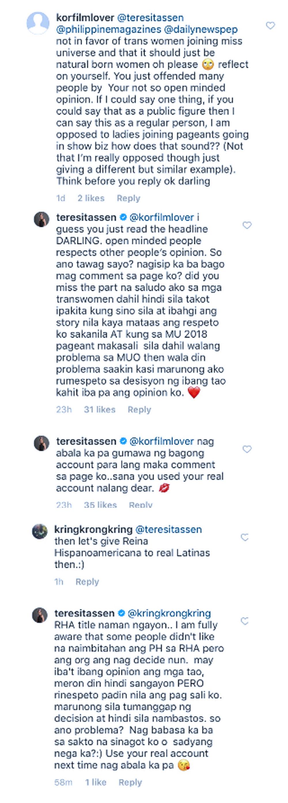 “Did you miss the part na saludo ako sa mga trans women dahil hindi sila takot ipakita kung sino sila at ibahagi ang story nila kaya mataas ang respeto ko sa kanila at kung sa MU 2018 pageant makisali sila dahil walang problema sa MUO then wala din problema sa akin.”