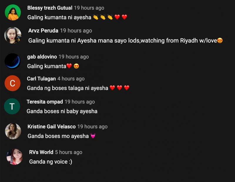 One user wrote, "Galing kumanta ni Ayesha [clapping emoji] [clapping emoji] [clapping emoji] [heart emoji] [heart emoji]."