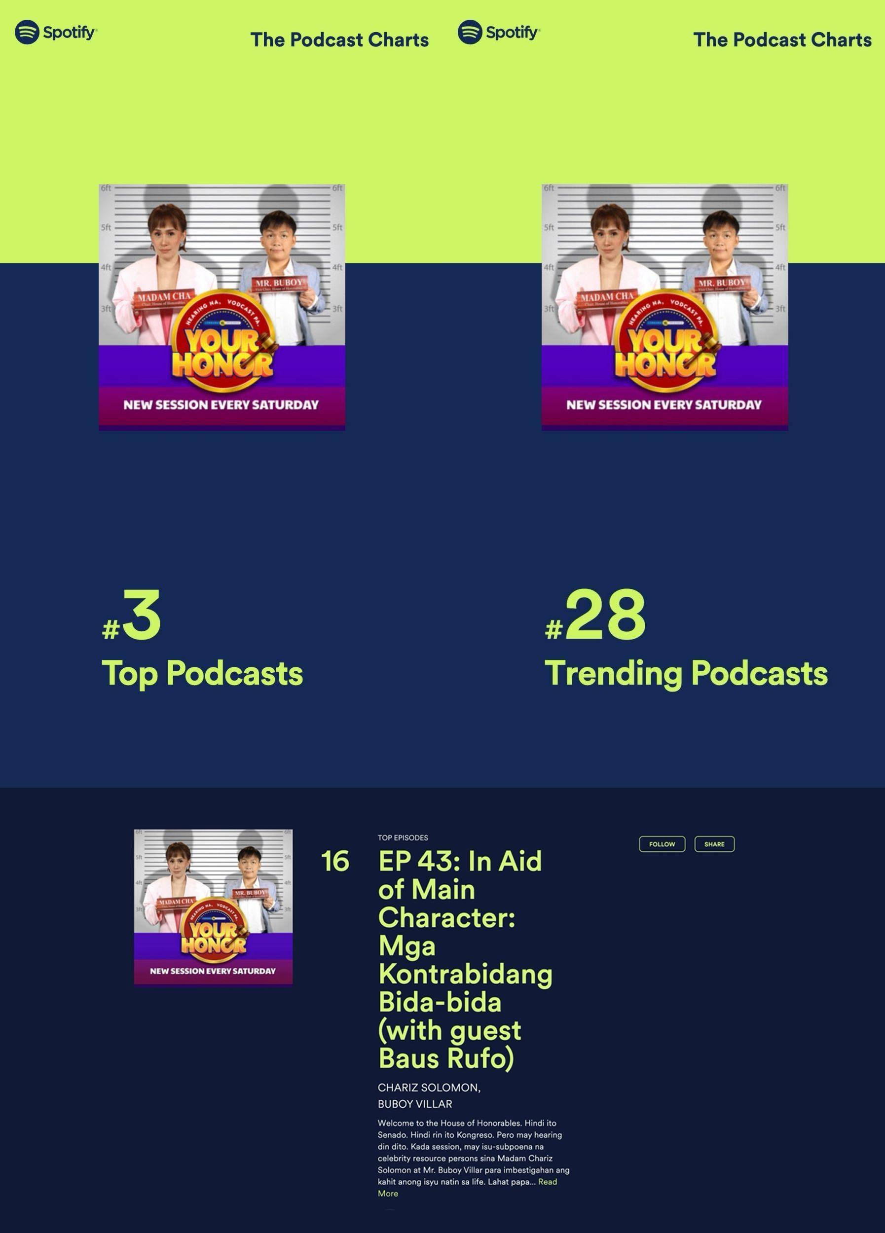 Based on the latest data from the music streaming platform, Your Honor secured the third spot in the Top Podcast category. Meanwhile, their episode featuring comedian and podcaster Baus Rufo also gained traction online, climbing to the 16th spot in Spotify's Top Podcast Episodes chart.