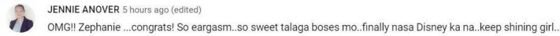 "OMG!! Zephanie...congrats! So eargasm..so sweet talaga boses mo finally nasa Disney ka na..keep shining girl," dagdag pa ng isang fan.