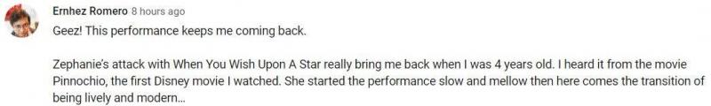 "Geez! This performance keeps me coming back. Zephanie's attack with 'When You Wish Upon A Star' really brings me back to when I was 4 years old. I heard it from the movie Pinnochio, the first Disney movie I watched. She started the performance slow and mellow then here comes the transition of being lively and modern," usisa naman ng isang netizen.