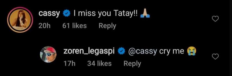 In the comments section, the First Lady star replied to her father's post, saying, “I miss you, Tatay!!”